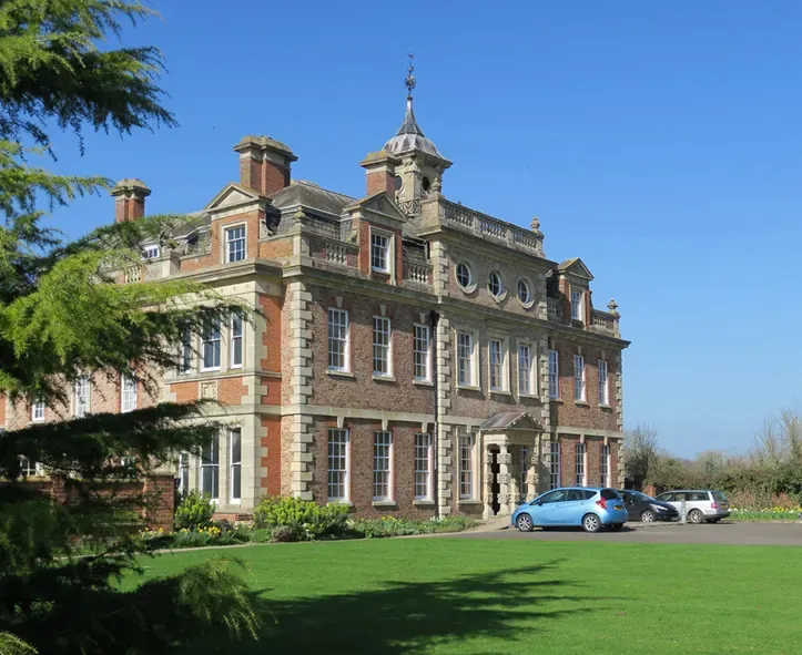 An elegant 18th-century garden filled with whimsical follies, woodland paths, and beautifully landscaped grounds famous for winter snowdrop displays.